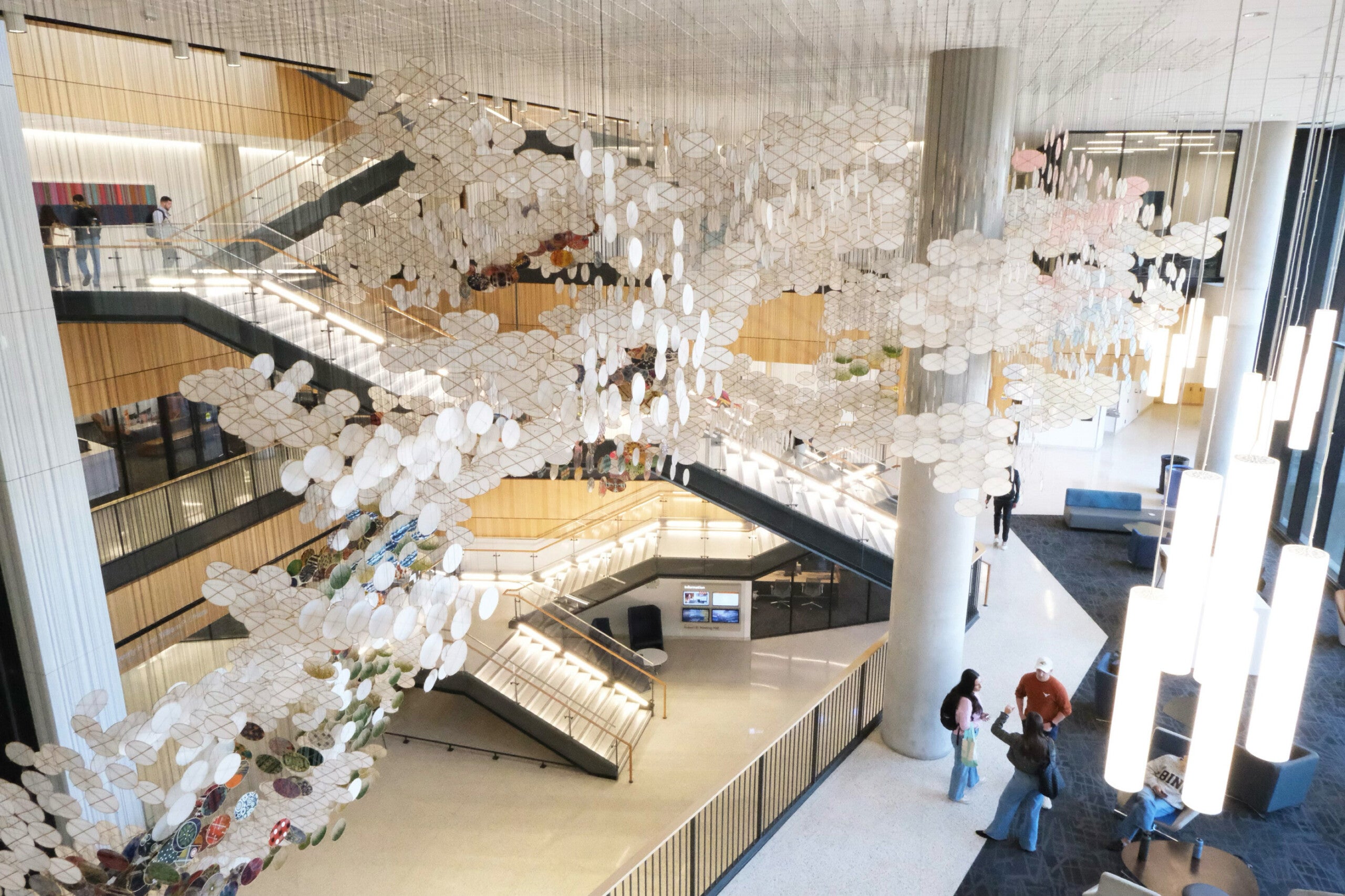 The cloud-like form is designed to be viewed from all sides and levels of the Rowling Hall atrium, and it draws on a lexicon of more than 500 graphics developed by the artist to reflect touchpoints suggested by the McCombs art advisory committee.