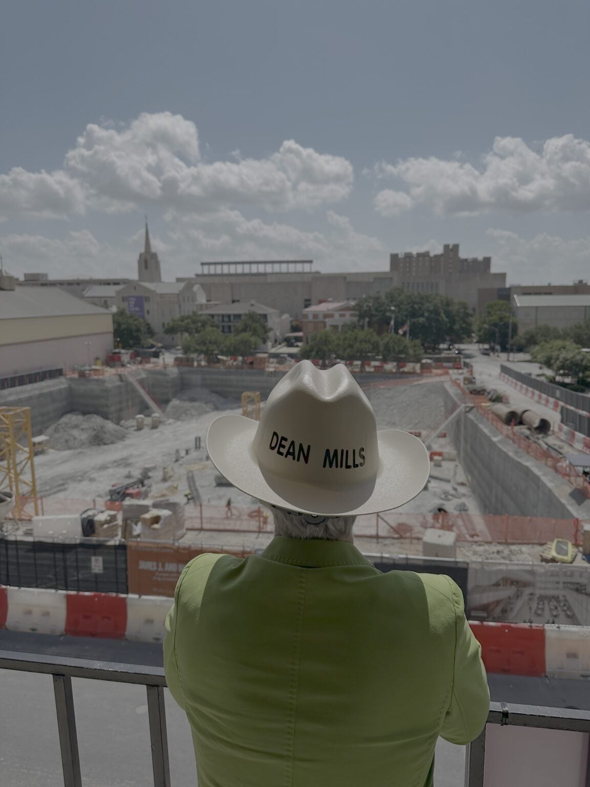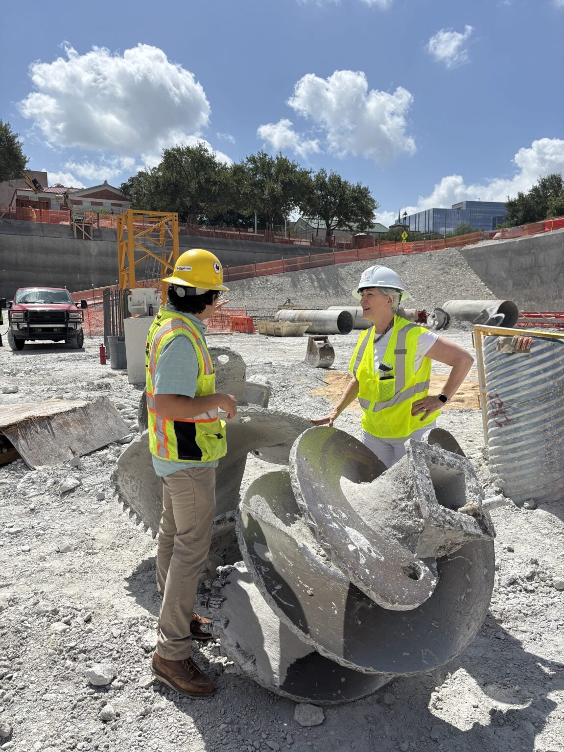 Dean Lillian Mills took a hard-hat tour this June with Jeremie Martinez, senior project manager at Austin Commercial, and learned a lot about piers, cranes, and building construction. The two cranes, which rise higher than the 373,000-square-foot academic building, were mounted on the first two concrete piers. More than 110 piers are needed to support the building columns, elevator lobby shear walls, exterior walls, and slabs. While a driller digs a deep, round hole, usually down to bedrock, workers assemble steel-bar-reinforced frames, which are placed in the holes, and concrete is poured. The concrete columns will be thicker at the bottom and thinner higher up because less support is needed as the floors climb higher.